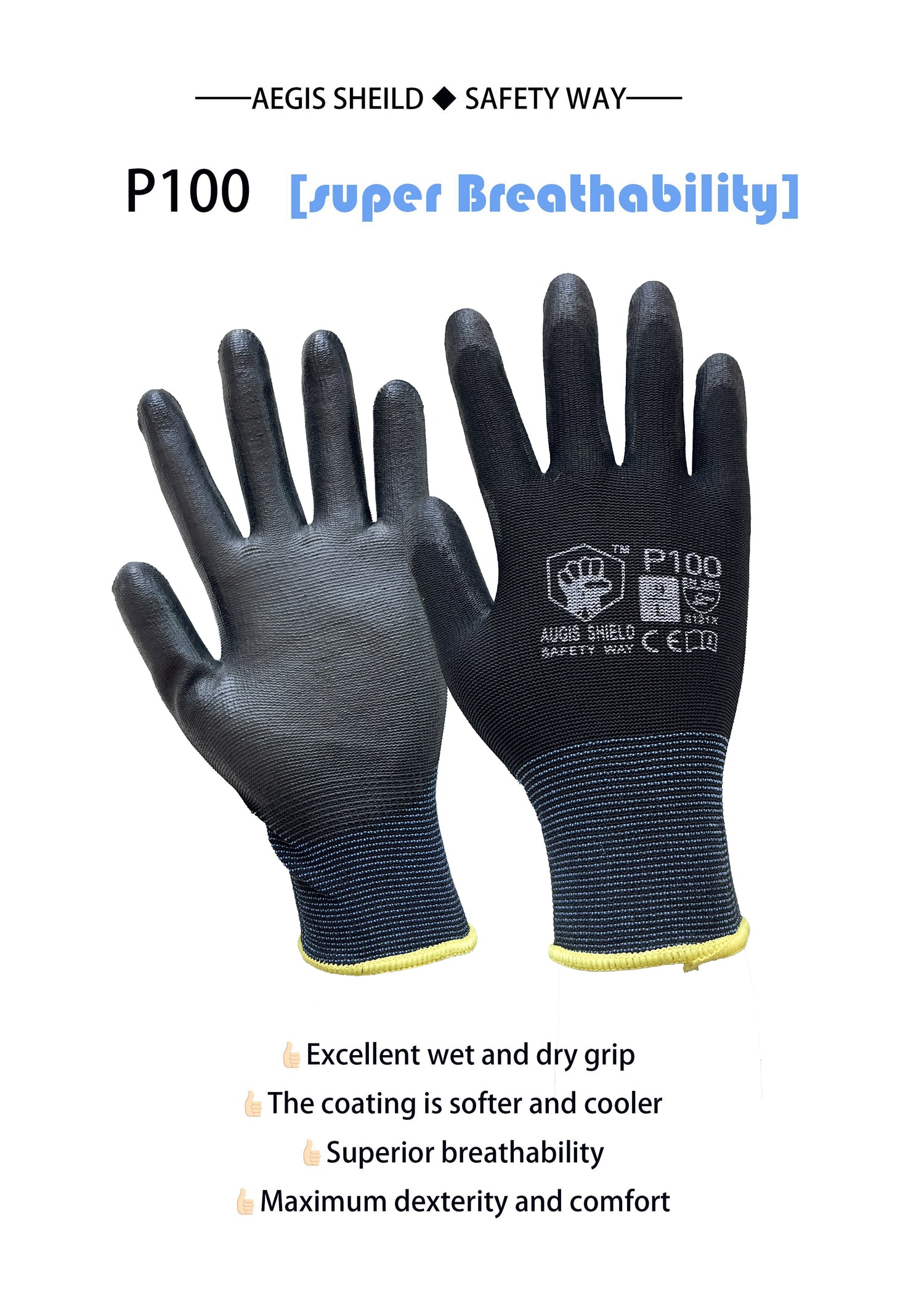 - These P-100 gloves have the formulation of the breathable PU coating for increased flexibility and fit, as well as enhanced grip in light oil environments for sure handling and extended glove life. Coating also hides dirt in environments with dirt exposure